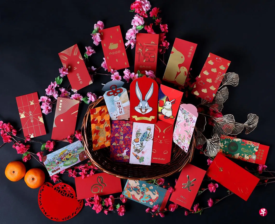 是画家亦是诗人的本地风水奇才陈军荣今年也针对不同的年龄层推出一套五封潮意十足的兔子红包设计。他说:“经过了前几年的平稳运势,今年兔年将会是运势大好的一年。因此,我们为不同年龄层,针对学生、单身者和乐龄人士设计了五款不同含义的红包。在每个红包封印上有趣的流行祝福语,如‘一夜暴富’‘身强力壮’‘逢考必过’‘次次拿A’‘颜值爆表’,配对新加坡人相对惯用的英语句,从而使祝语变得更生动有趣,达到本土化的效果。”陈师傅的红包设计也融入两种“永续”的思维:红包封以日本御守挂符为设计概念,沿着红包封口上的虚线剪出洞,把红包封挂放在书桌和自己每天看得到的地方能继续环保重用,同时又能让自己持续享有整年的好运。