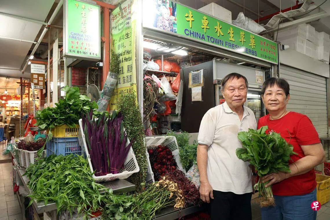 在牛车水大厦底层的巴刹,有一个绿意盎然的摊位,但卖的不是蔬菜。陈满发(74岁)和黎焕萱(71岁)从长辈手中接过草药生意已有40年。