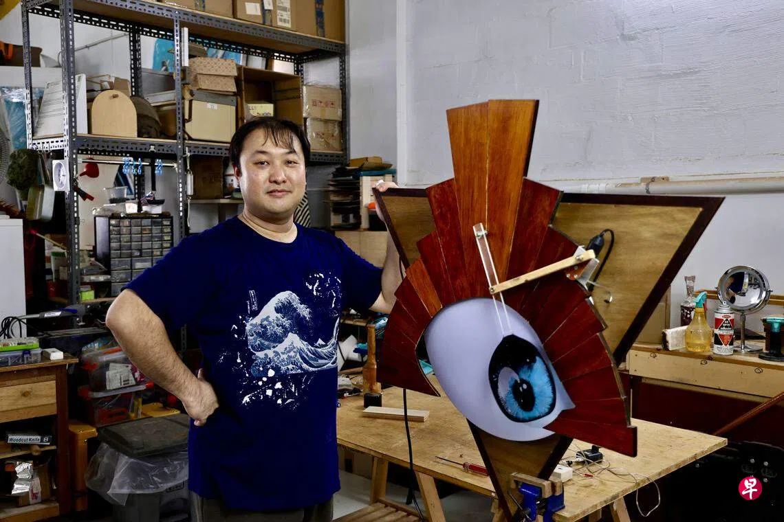 毕业自南洋艺术学院雕塑系的杨劼(39岁)觉得个展“感官锚”作品不够完整,继续探索,最新个展“半生不熟意念间的12杯茶”,以咖啡店器物制成15件小型动态雕塑(kinetic sculpture)。