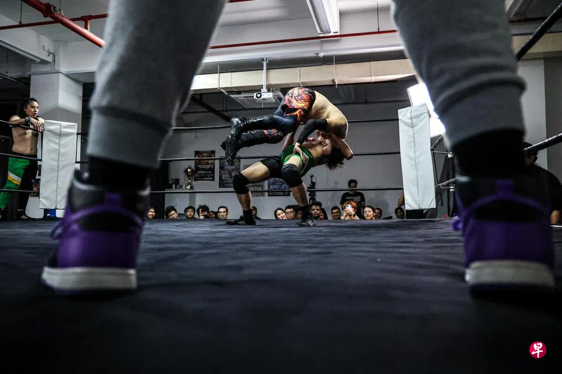 星期六夜晚,乌美一道一栋工业大楼四周无人,显得很安静,但四楼的一个单位却正在进行一场别开生面的活动,推开沉重的铁门,你或许会被眼前的热闹景象所震撼。有大约70人围绕着一个擂台兴奋地欢呼,台上有几名摔角手正展开激烈对决,他们时而将对手狠狠地摔向地面,时而用身体猛烈碰撞,每一个动作都伴随着嘶吼声和观众的呐喊。很难想象在新加坡竟有如此激情四溢的职业摔角(Pro Wrestling)表演。
