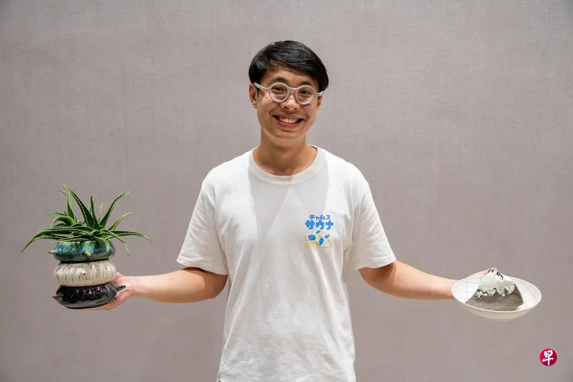 在不久前举行的第四届新加坡陶艺节上,周子阳(27岁,hansclayground.com)的摊位很特别,宛如长刺层叠的陶瓷器皿以芦苇、茄子和蒲公英点缀,令人置身花园中。这位日本东京多摩美术大学陶瓷学士认为陶艺太沉溺于一己的世界,缺少与别的领域对话。他与提供花卉植物的友人Fawn World合作,另类呈现作品。陶盘上摆着一块看似雪山的“蛋糕”,实是黑土白釉《黑雪》,充满想象力。普通陶盘采用日本传统技法“刷毛”,创造草草不工的图案。
