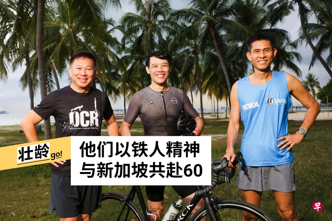 为庆祝新加坡建国60周年,60岁的陈朝义和两名同龄队友,参加今年4月的T100职业铁人三项赛新加坡站的两项接力项目。曾效力特种部队六年的他说,铁人运动是很挑战意志力的运动。