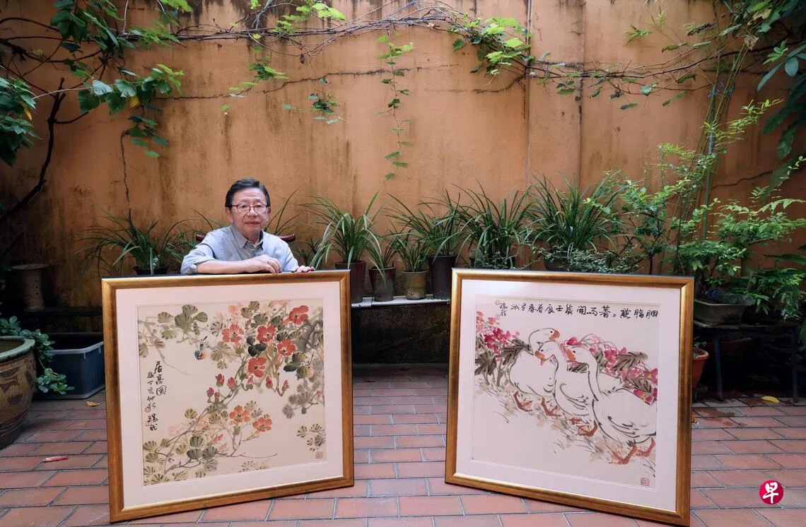 我国著名书画家赖瑞龙(79岁)祖籍中国潮安,却归服于新加坡潮阳会馆。这20多年来,他的画室(斋号“养砚楼”)设于会馆内,无偿使用,经历了“三迁”,现位于会馆后方,画室外有个清幽的小花园,花草藤蔓自成天地。他每天进来画室喂鱼和创作。