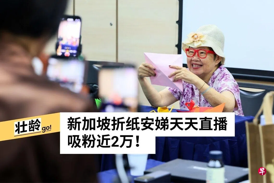 大红色镜框,极具辨识度的花朵编织帽,69岁的罗芍雰(TikTok账号@aunty.linda.loh)宛如一位宠溺孙子的阿嫲,在直播镜头前耐心地手把手示范如何折纸天鹅。桌上还摆放着色彩缤纷的纸青蛙、小兔子等充满童趣的折纸作品,勾起观众儿时回忆。
