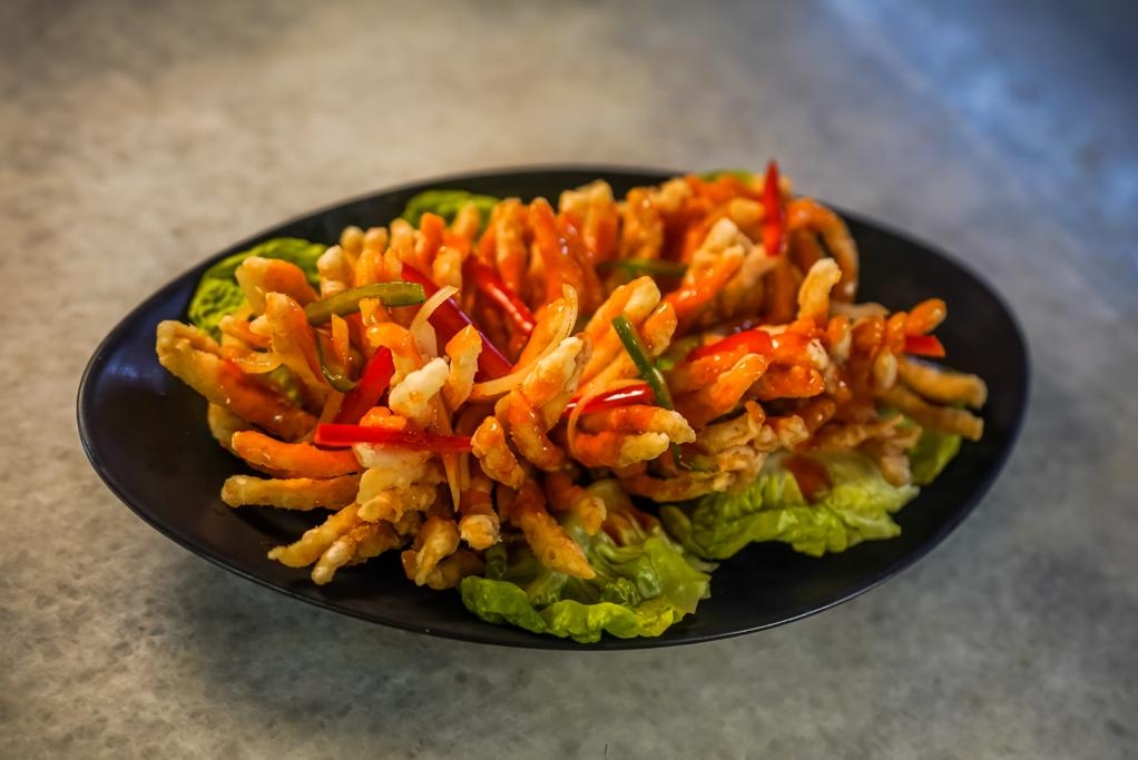 尽管所有菜肴都不用猪肉,师傅仍能以海鲜和鸡肉变出花样。说到刀功的体现,首推珊瑚鱼($26)。这道菜类似中菜的松鼠鱼或松子鱼,不过师傅采用肉质较结实的生鱼,难度在于鱼肉切成十字花时要切得很深,才能炸得更开,看起来像珊瑚。这道菜去头去尾去骨,非常容易食用。酸甜酱汁加了黄梨和橙,带有果香。