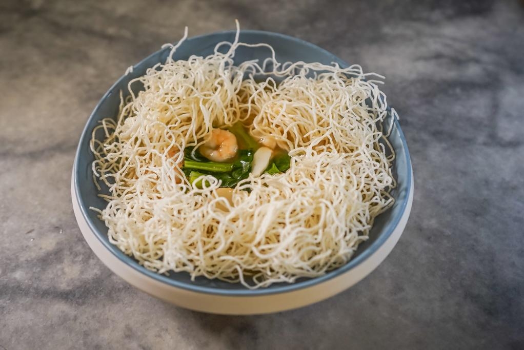 另有两道米粉料理也在传统中寻求突破,爆炸米粉($10/$18)将米粉炸成鸟巢状后再淋上海鲜汁;黄焖米粉($21/$20)则以金瓜和萝卜熬制的上汤来焖米粉。
