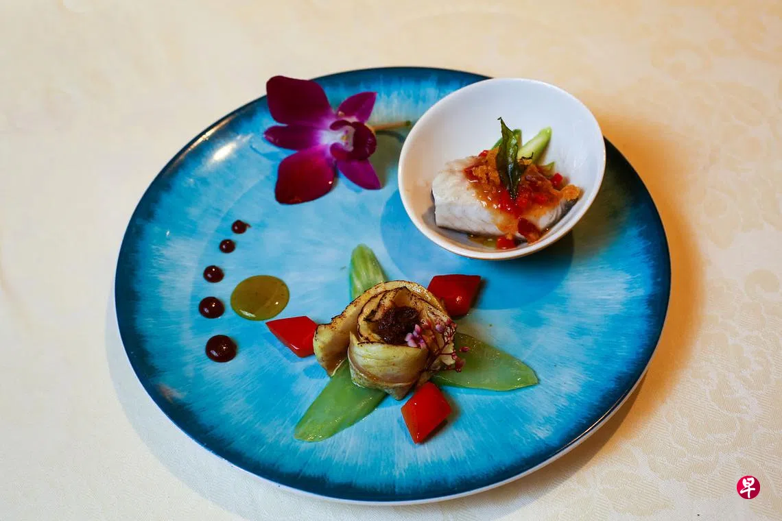 新加坡除了进口鱼类,也发展本地渔场养殖业,包括以高科技室内养殖鱼类。金牡丹餐馆本月开始推出的可持续性食材新菜单里,其中一种特色食材便是本地蓝海洋水产养殖科技公司养殖的翡翠鲈鱼(jade perch)。其它本地食材还有植物蛋白食品和蔬菜。