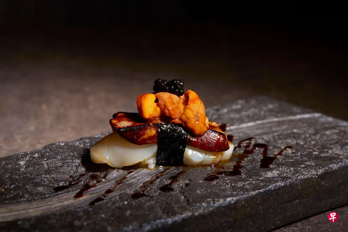 在市区安国酒店(Amara Hotel)里新开的“厨师做主”(omakase)餐馆Sushi Yujo,“Yujo”指的是友情,主厨想传递的不仅是顾客之间的友情,也希望能够通过美食,为师傅与顾客建立友情。餐馆装潢主题是很“酷”的冰砖和艺术雕刻。坐在料理台前细看,会发现墙上的花朵会一张一合,还真有疗愈作用。餐馆有三个厢房,料理台可坐13人。