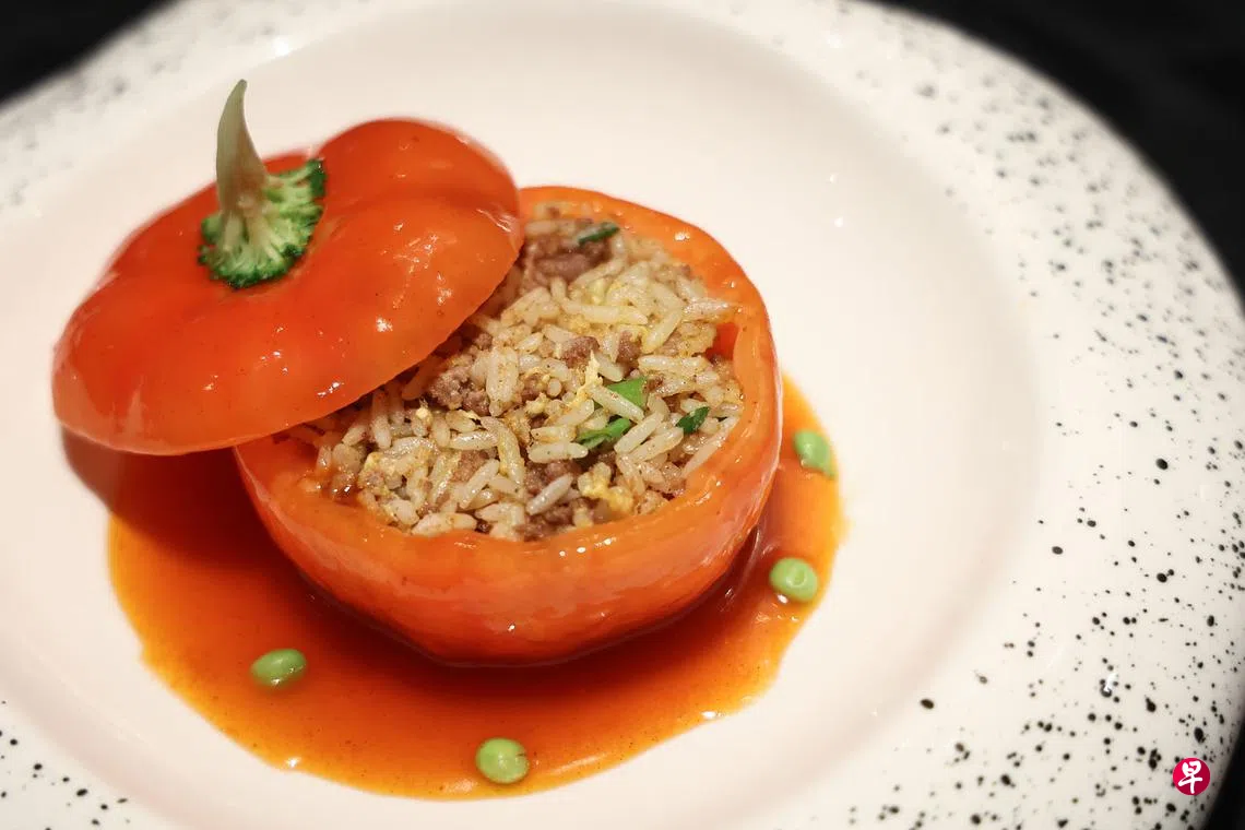 新菜品番茄炒饭,吃起来有番茄的酸甜味,牛肉软嫩可口,炒饭粒粒分明,也带有镬气。将炒饭盛入番茄盅里,不仅味道升级,造型也加分,多一分美感。