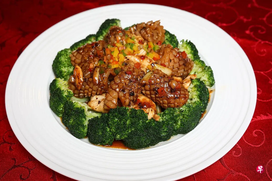 这道菜简单易做,最耗时的是水发鱿鱼的步骤。他说:“市场上有售卖已经发好的鱿鱼,十分方便。如果要自己发鱿鱼,先把鱿鱼泡水两小时,再用碱水浸泡八小时即可。”