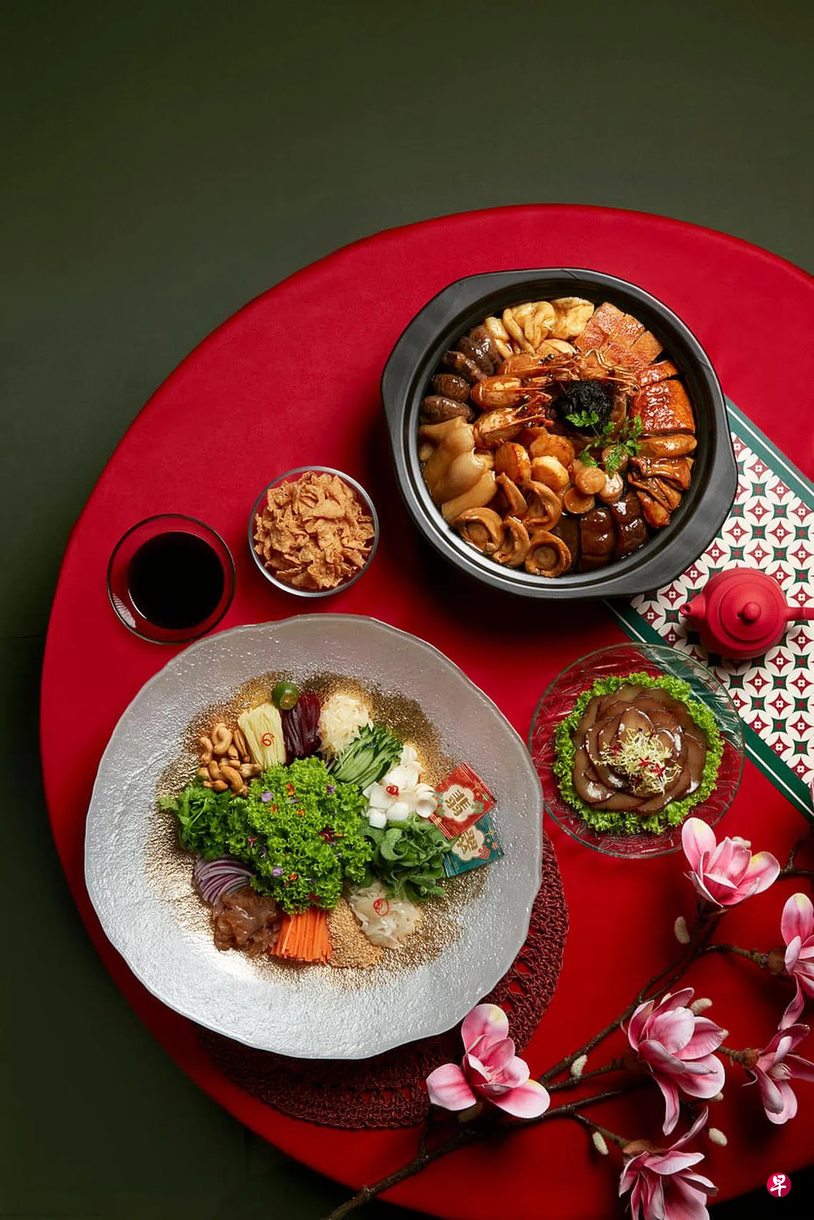 年菜除了色香味,也讲究吉祥如意。翡翠集团的新年鱼生“玉兔迎春五谷丰登捞参”特地选用海参,带好兆头。