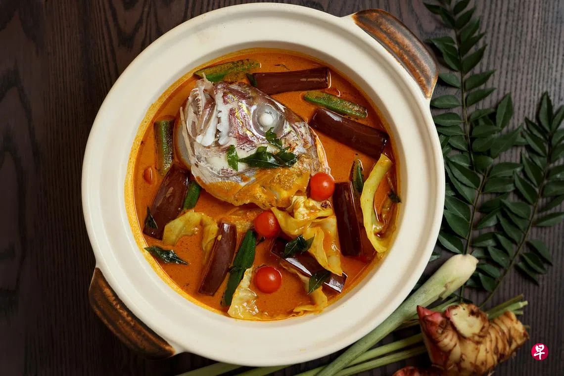 他说:“蒸鱼头的时间视鱼头大小而定,一般900克至1公斤的鱼头,蒸约15分钟。红哥里的肉质较实耐煮,不易散开,最适合做咖喱鱼头,也可考虑红鲷。咖喱鱼头以香浓为主,不应该太辣,才能尝到鱼头的鲜美。如果放太多辣椒或咖喱粉,吃了会很腻。”