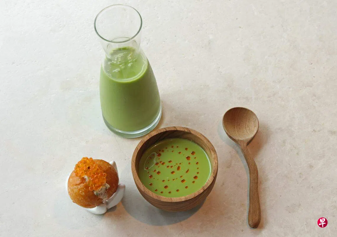 位于滨海湾花园花穹(Flower Dome)的Marguerite餐馆主厨威尔逊(Michael Wilson),要跟读者分享生菜西班牙冷菜汤与蟹肉甜甜圈食谱,它适合狮城的热带气候,作为晚餐派对的开胃菜,也足够气派,令人印象深刻,属于一道容易在家轻松准备的料理。