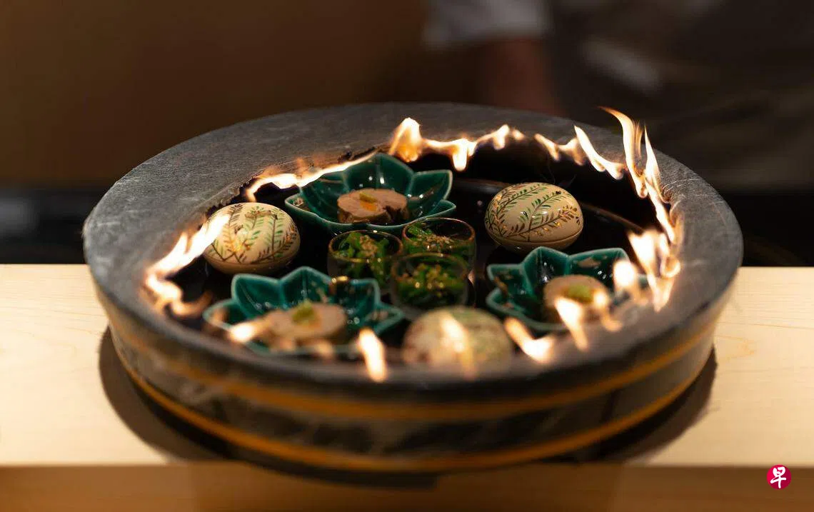 呈现八寸拼盘(hassun)时,厨师加入火焰视觉效果,让人食欲大开。安康鱼(monkfish)鱼肝和鱿鱼圈,都是工序繁琐的菜品,前者要先冰镇后以日式高汤清蒸两小时,后者则是要将内脏清理干净,吃到了厨师的细心制作。