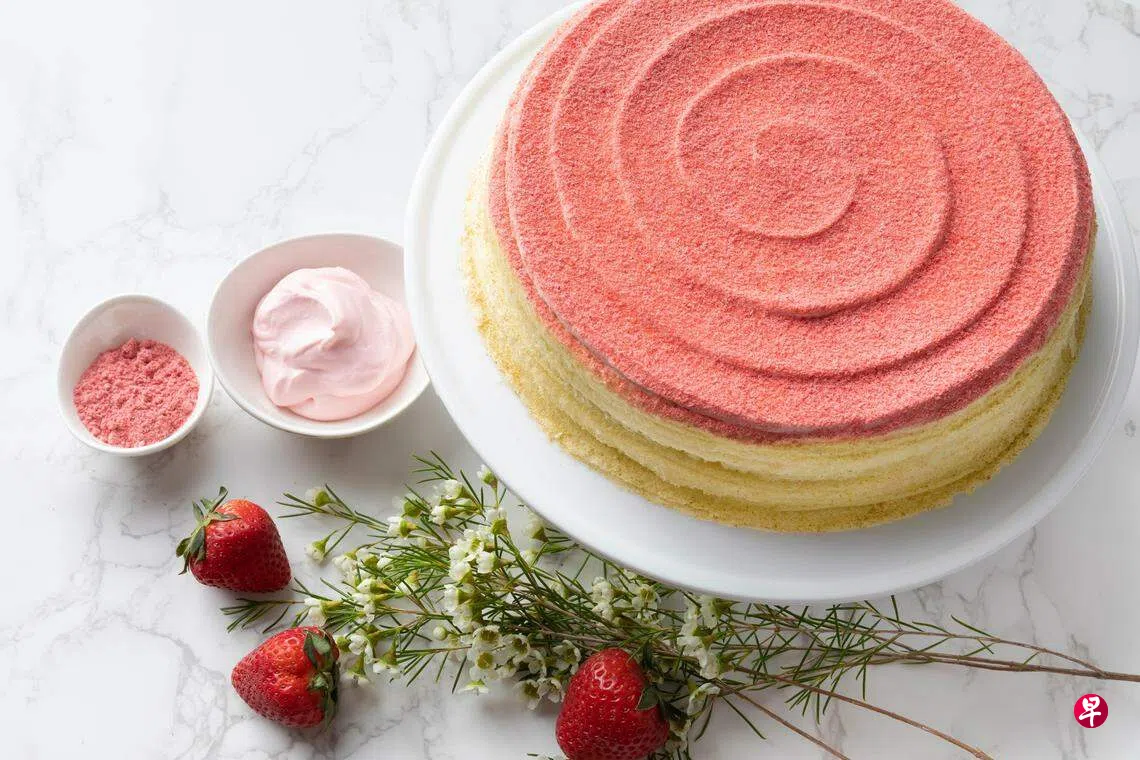 草莓法式千层蛋糕(Strawberry Swirl Mille Crepes)以松软的草莓海绵蛋糕为主,结合层层饼皮和草莓奶油,形成轻盈甜美的滋味。