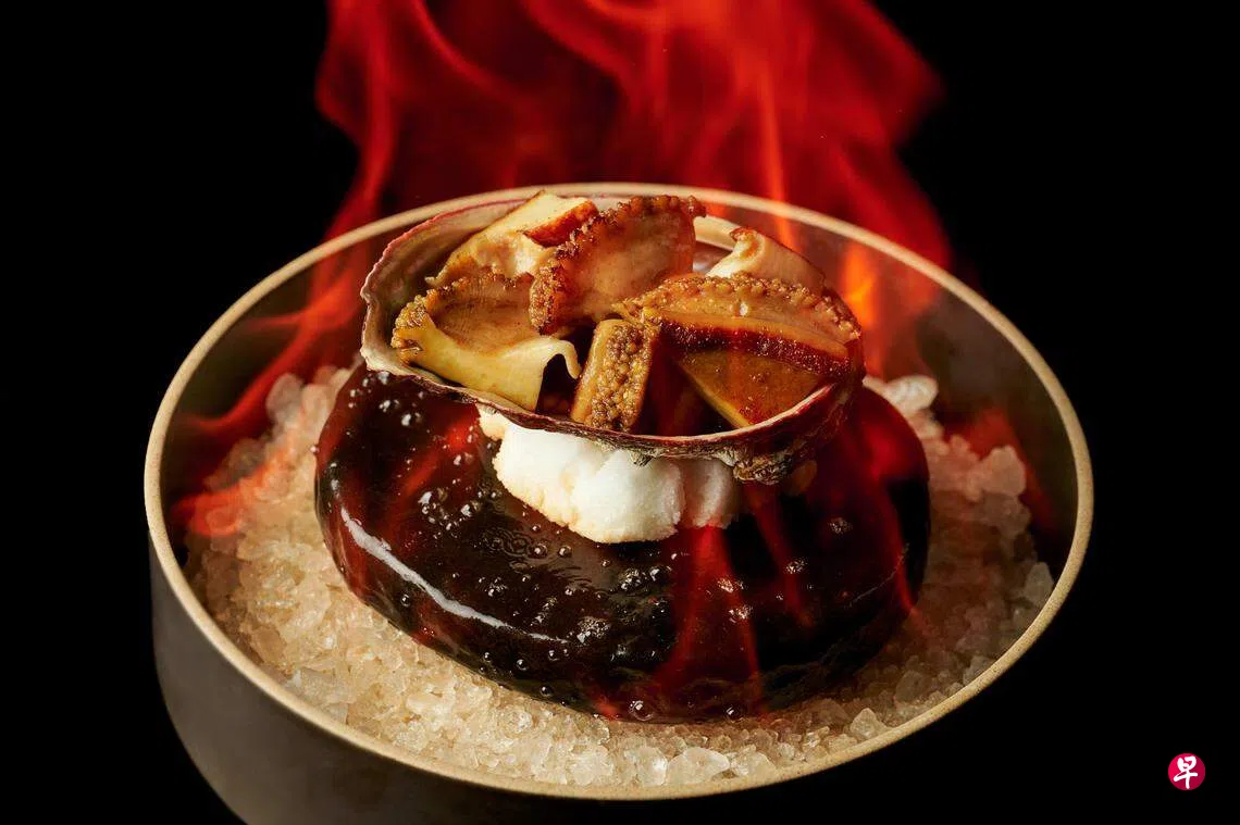 这次主厨在烹制和呈现方式上花了心思。日本鲍鱼(市价)先以日本清酒蒸后放在铁板烧上煮熟,他特地在餐桌旁秀了小小火焰秀后淋上鲍鱼干酱。吃乳酪蛋糕时,添加一款以液氮速冻的紫苏叶,叶子外层变得爽脆,主厨一把抓碎洒在餐盘中,有一种落叶的诗意美感。