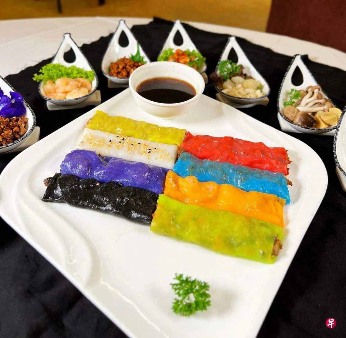 桃苑餐馆推出限量八色肠粉,让这道粤式点心增添缤纷色彩。