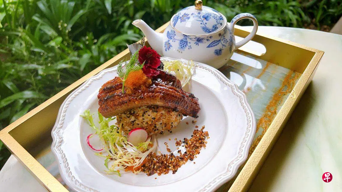 食物方面,纳入了日本茶泡饭的概念。吃微炙牛肉时倒入肉骨茶汤、烤鳗鱼饭倒入铁观音茶味的肉汤,汤底以英式茶壶盛放,结合东西方元素,摆盘相当吸睛。