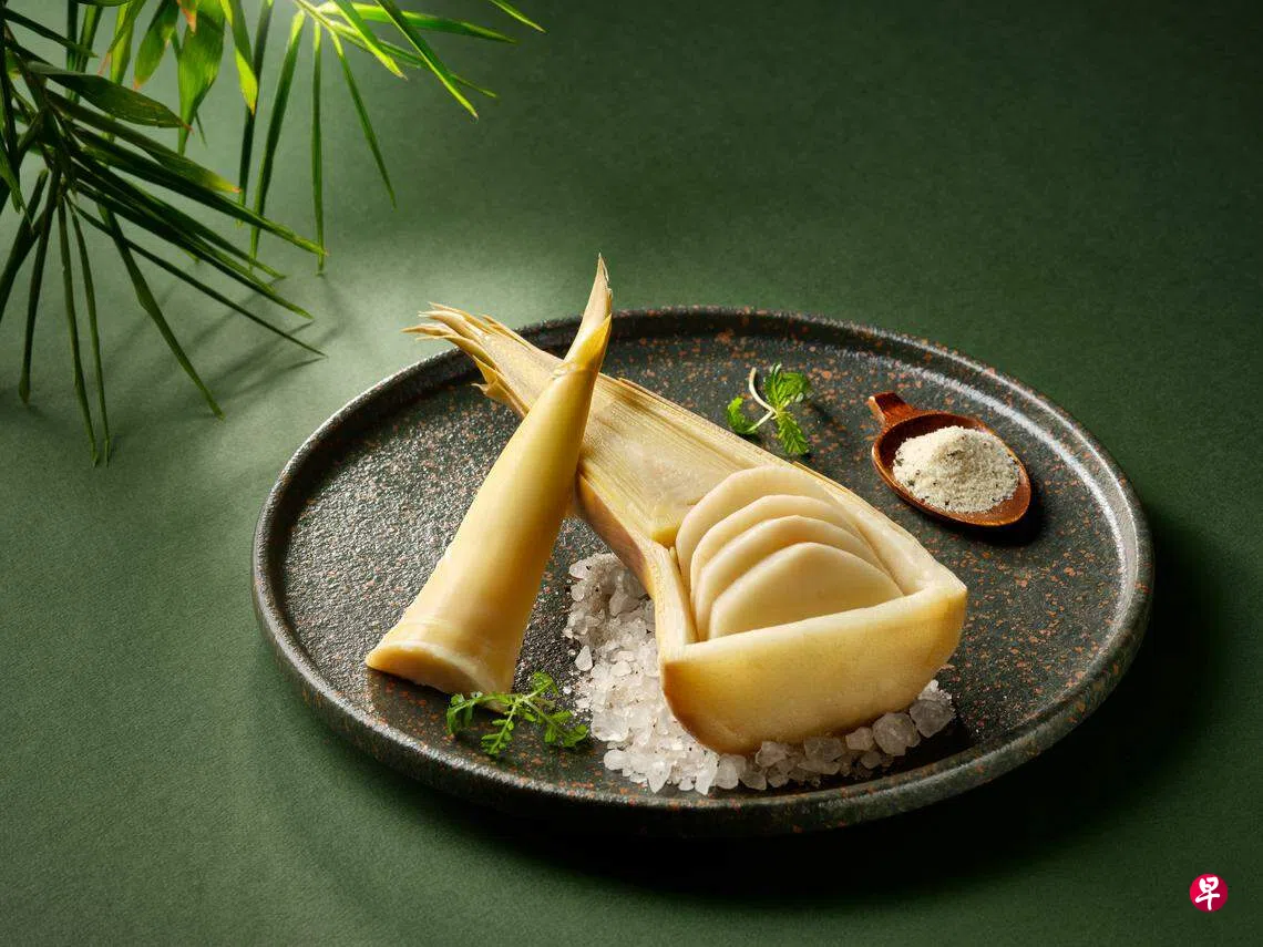 四川豆花饭庄和台湾米其林绿星餐馆“阳明春天”携手推出蔬食宴,春季至初夏产季最佳的绿竹笋清甜爽脆。