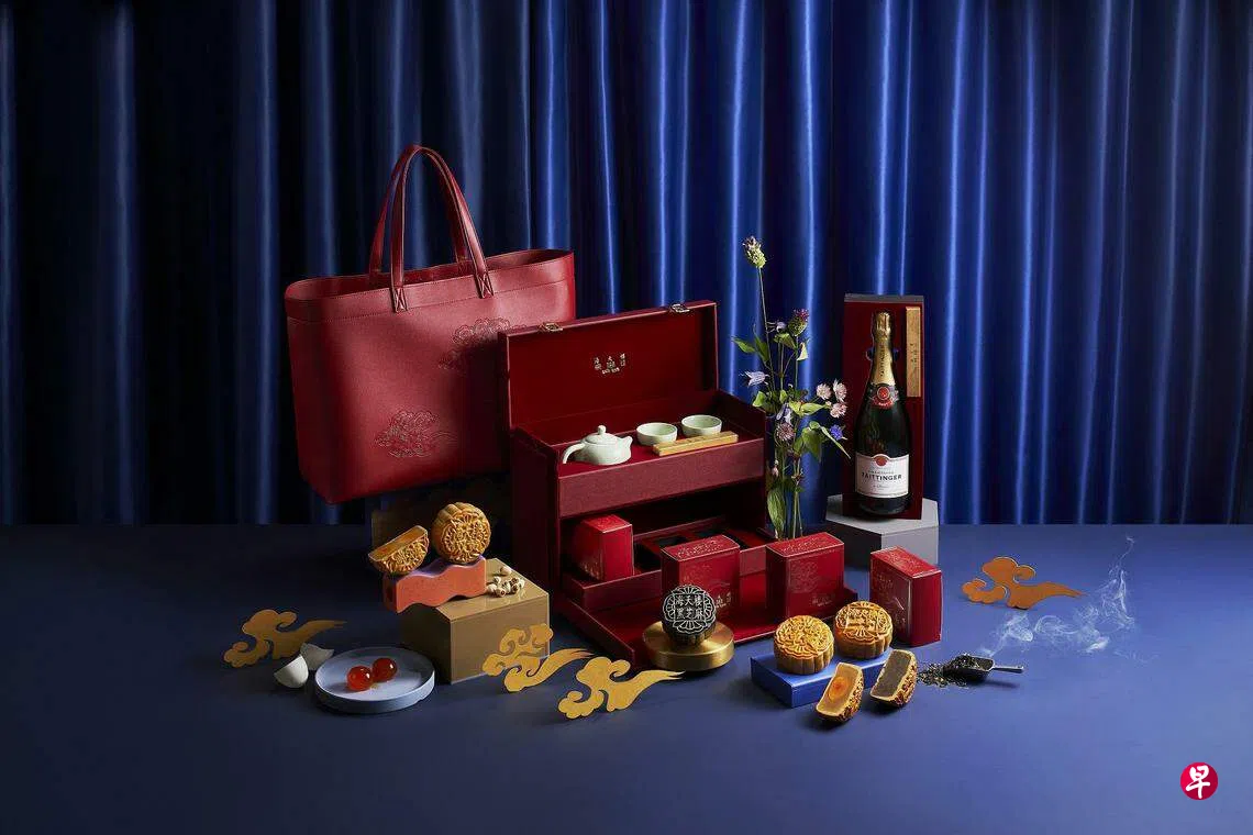 喜欢吃烘皮月饼,可选四喜烘皮月饼礼盒($94),含海天一号白莲蓉月饼、双黄白莲蓉月饼、单黄白莲蓉月饼和黑芝麻白莲蓉月饼。可选搭配茶具和一包茶叶($178),或一瓶Taittinger Brut Reserve香槟($278),送礼更显奢华。