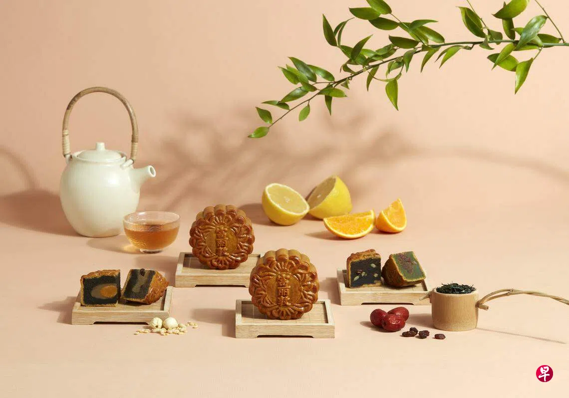 新登场的富丽敦茶系列烘焙月饼($86),有阿萨姆茶柠檬丝绿豆馅葡萄干、铁观音香橙杏桃、绿茶黑糖五谷、红玉红茶柚红枣松子,每个月饼都散发悠悠茶香。