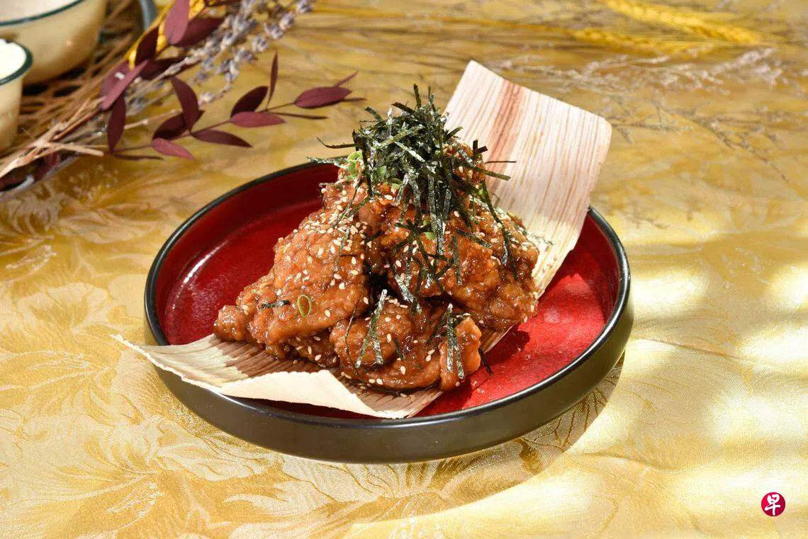 鸡块捞起沥干油,倒入盛着酱汁的平底锅,混合均匀。最后撒上紫菜点缀,即可上桌。