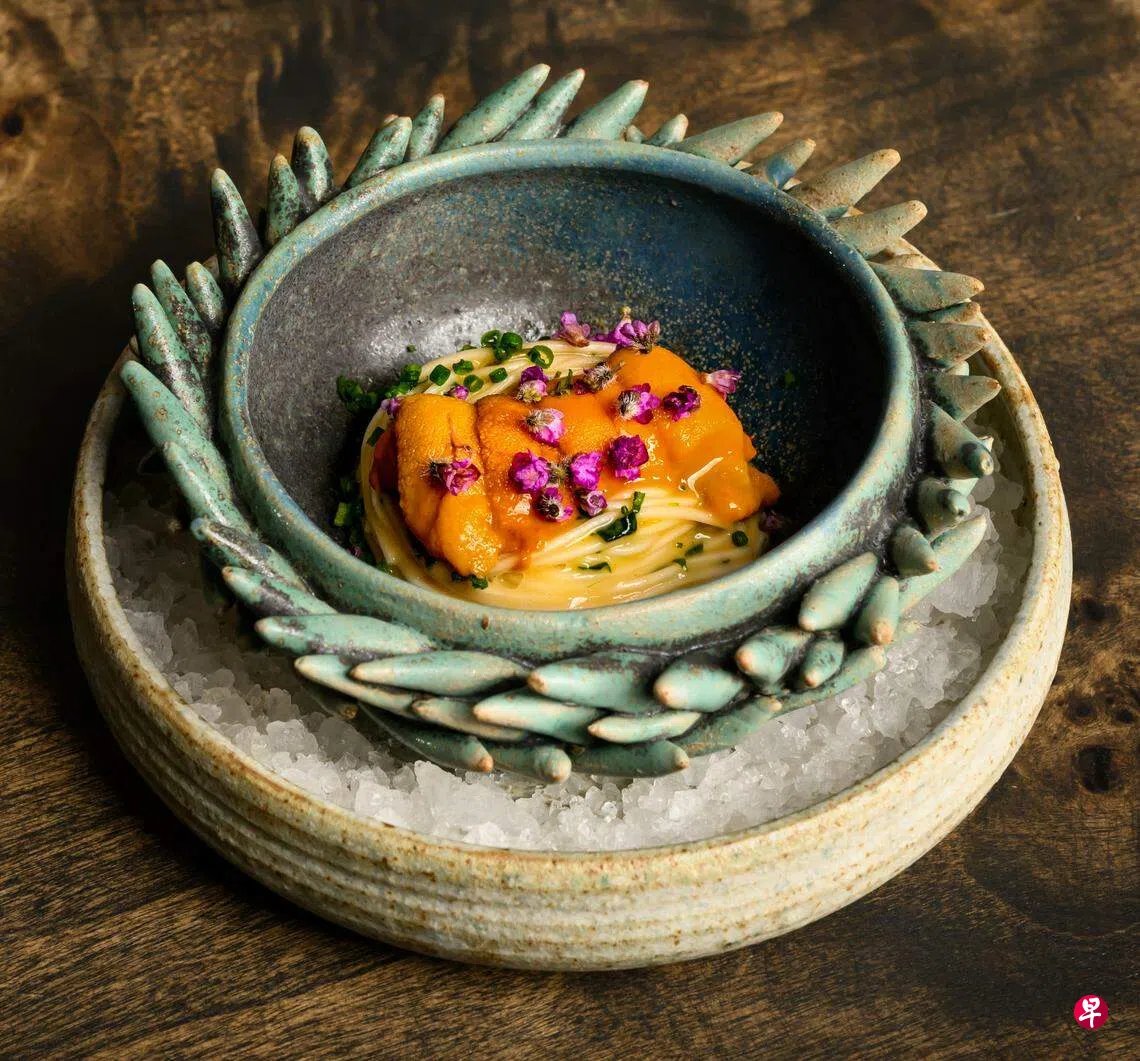 从小前菜(amuse bouche)、主食到甜点,道道有惊喜。招牌海胆素面(Somen)2.0,让人尝尽了海胆的软糯香甜。刘骏义谈到这道面食背后的灵感时说:“我个人很喜欢美味的面食,想要将看似简单、朴素的面条,提升为奢华且鲜明新鲜的料理,作为多道料理中的其中一道。季节性的海胆带有淡淡的奶油味,发酵芥末叶的酸度,中和了酱汁的浓郁度。日式高汤增添咸香,而清酒提升了酱汁的鲜味。我们新的2.0版本,加入生的日本红虾,让这道面食更上一层,口感层次更丰富。”
