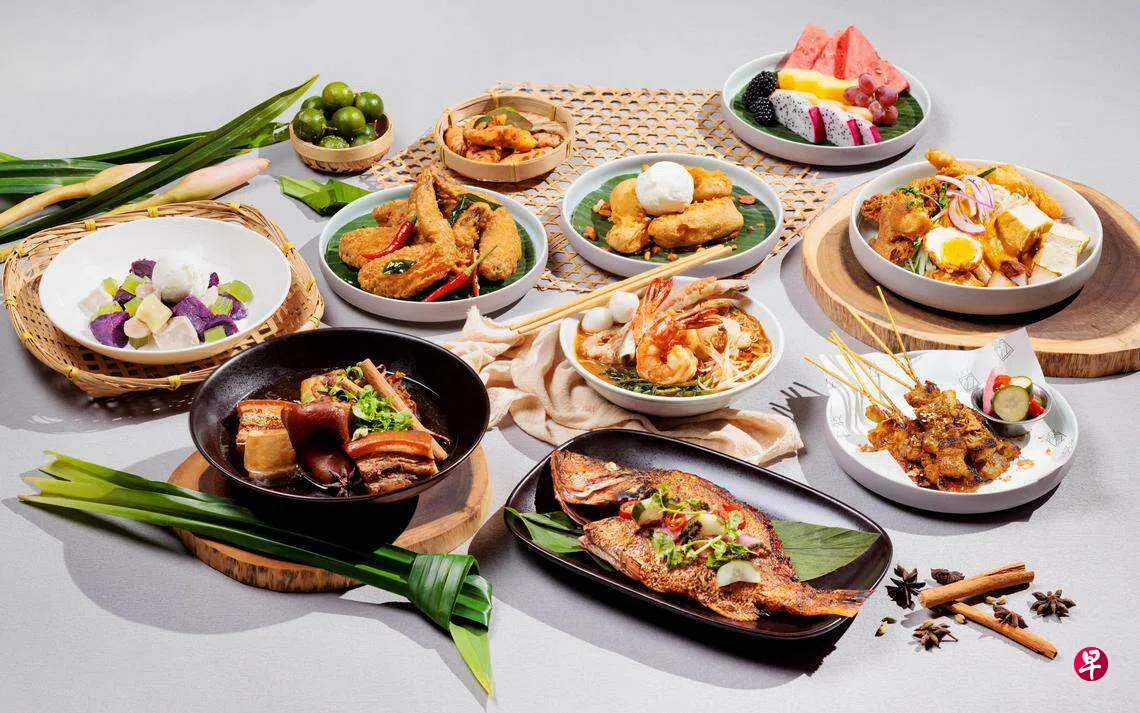 前菜Satay Bohong的“Bohong”是马来语“欺骗”的意思,因为一般沙爹不用猪肉,这里选用西班牙黑猪肉来制作(Kurobuta Pork)。其他前菜有虾酱鸡、小金杯和炸乌打球等。主食Changi Ikan Sumbat Sambal是一道将本地红绸鱼抹上参峇的烤鱼,鱼肉鲜嫩,配搭覆盖在表层的香料。另一道牛脸颊仁当则炖得软绵入味。