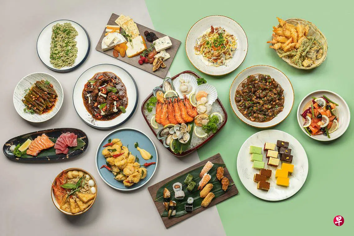 自助餐设有10多个餐区,从冰镇海鲜、日本料理、本地美食到经典亚洲菜肴,包括麻辣小龙虾米粉、新加坡叻沙、清蒸鱼配娘惹亚参咖喱、黄金肉松老虎虾和姜葱炒牛肉等。菜单会定期轮换。