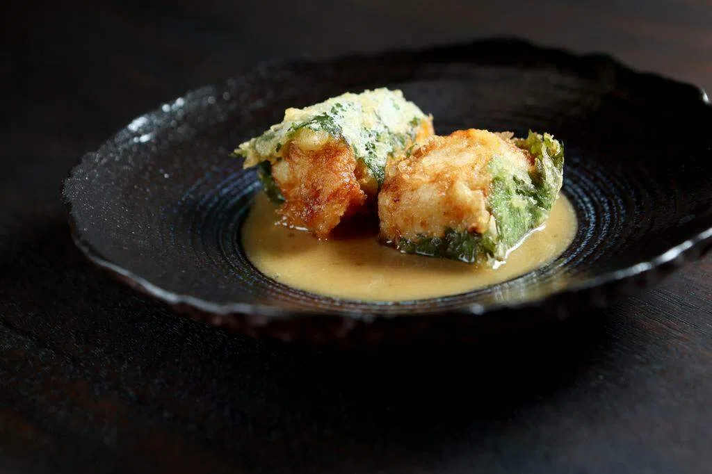 4. 摆盘时,将豆腐球放在黑炭豆腐上面,淋上千岛酱。