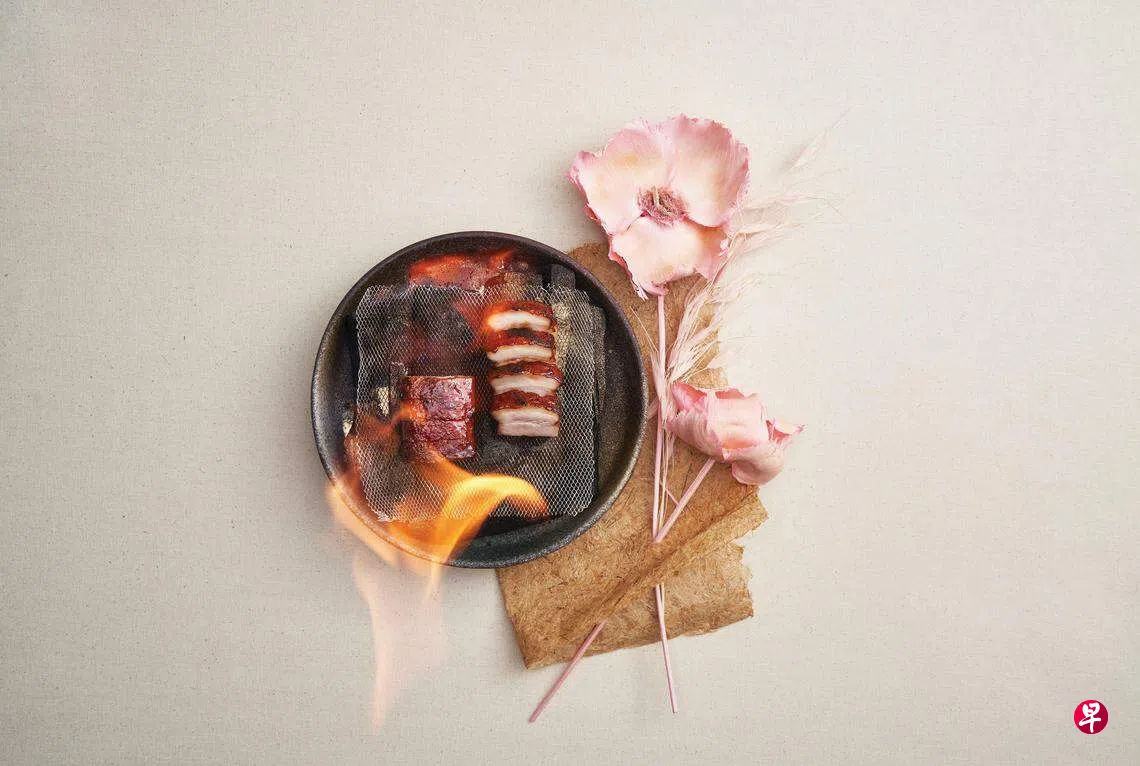 烟熏黑豚肉,灵感源自周星驰电影《食神》里的黯然销魂饭。周星驰在戏里以叉烧、荷包蛋和洋葱等简单食材做出“黯然销魂饭”,打败其他珍馐百味夺得烹饪比赛冠军。厨师以苹果木烟熏伊比利亚五花肉,搭配煎蛋和米饼,荷包蛋改用鹌鹑蛋,烧腊饭以米饼代替,小巧精致的五花肉富烟熏香气。