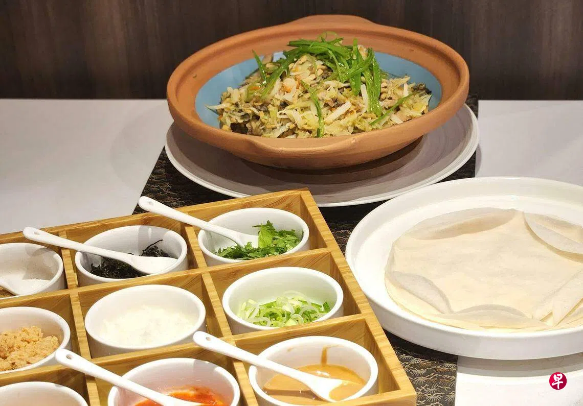 茶油老姜走地鸡(半只$28)以福建出名的山茶油(有“东方橄榄油”美称)将老姜煸香后,再加入走地鸡块干炒,连配角干煸老姜片也很好吃。闽南薄饼($32)的材料有包菜丝、荷兰豆丝、笋丝、肉丝和海蛎等。九宫格酱料和配料有贡糖、芝麻酱和紫菜等,整体口感和南洋薄饼很不一样,可选择自己包或请服务员帮忙。