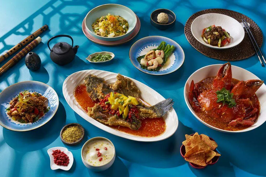 套餐可选择吉祥套餐(两人$128++至10人$598++),或包括盆菜的鸿运套餐(两人$168++至10人$798++),当中包括鲍鱼鱼生、妈祖平安面、虫草花鱼鳔蟹肉羹、板栗海参煲、糖醋黄花鱼、脆皮蒜香鸡、黑松露炒带子和红团等。