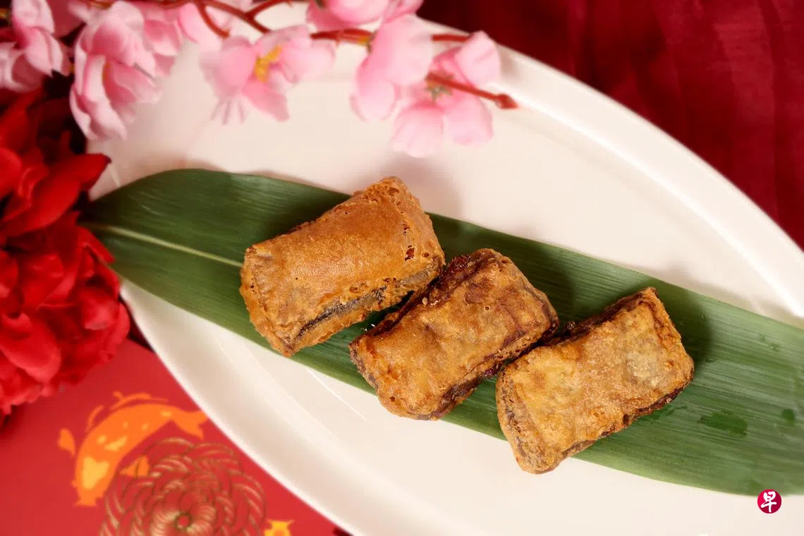 乌节大酒店中餐馆华厅的传统年糕,代表了经典古早味。炸得金黄色的四方块年糕,裹上主厨钟立辉独家调制的面糊,趁热咬下,外酥里糯,富有椰糖香的年糕有如麦芽糖般甜蜜讨喜。这款年糕厉害在于,就算凉了依然保持外衣酥脆,显示师傅调制面糊的功力。