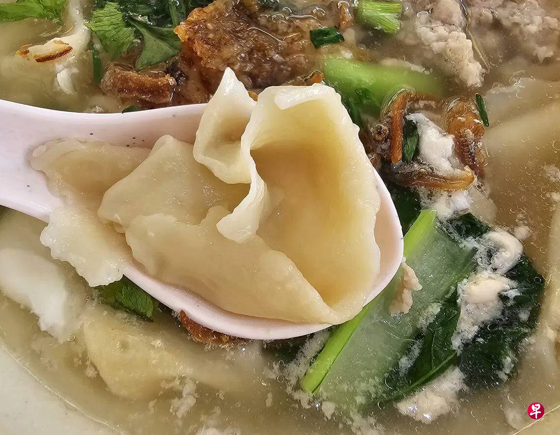 选吃传统手工面汤($5),面粉粿加肉碎、半熟鸡蛋、马尼菜、炸葱、江鱼仔等,属经典滋味。原本见面粉粿切得工整,以为平平无奇,但吃起来有嚼劲,带来小惊喜。汤底没有厚重咸味,相当讨喜。