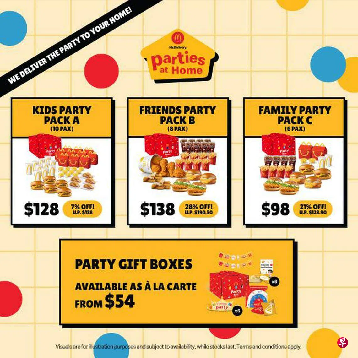 儿童派对套餐A($128)内含10份开心餐,每份开心餐可选择芝士汉堡或麦乐鸡块。朋友派对套餐B($138)包括:六个麦脆鸡腿、两个麦辣鸡汉堡、两个麦香鱼汉堡、两份六片装麦乐鸡、八份薯条及八份饮料,可供八人享用。家庭派对套餐C($98)则包括:两份麦辣汉堡、两份鱼排汉堡、四份中型薯条、四份饮料,以及两份开心餐,适合六人享用。