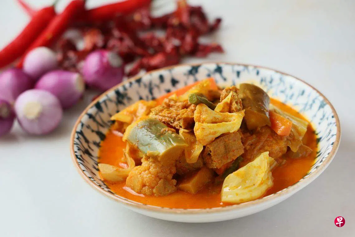 娘惹餐馆Indocafe Peranakan Dining主厨王永和(42岁)说,咖喱杂菜的食材,是一般家常菜会用到的蔬菜,包括茄子、萝卜、包菜、包菜花、长豆和香料。蔬菜讲究新鲜,烹煮出的咖喱杂菜味道自然美味可口。另一关键食材是娘惹香辣酱(rempah),让这道菜肴香辣带劲。