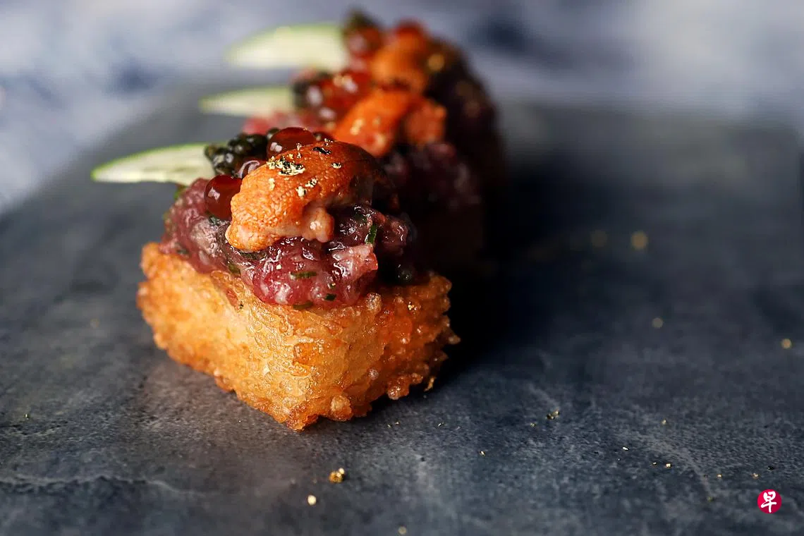 特别推荐米饭佳肴,除了从日本东京丰洲市场(Toyosu Market)进口食材制成日式刺身盖饭($52++),海胆鱼子酱鲑鱼卵炸饭块($22++)和泡菜饭团($14++)都值得一试。