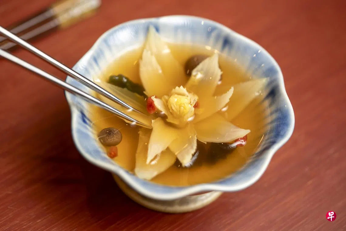 汤品味道鲜美浓郁,结合红枣的甜和柚子的柑橘香气,将韭菜汤汁缓缓倒入盘中还能捕捉到大白菜“花朵绽放”的瞬间。