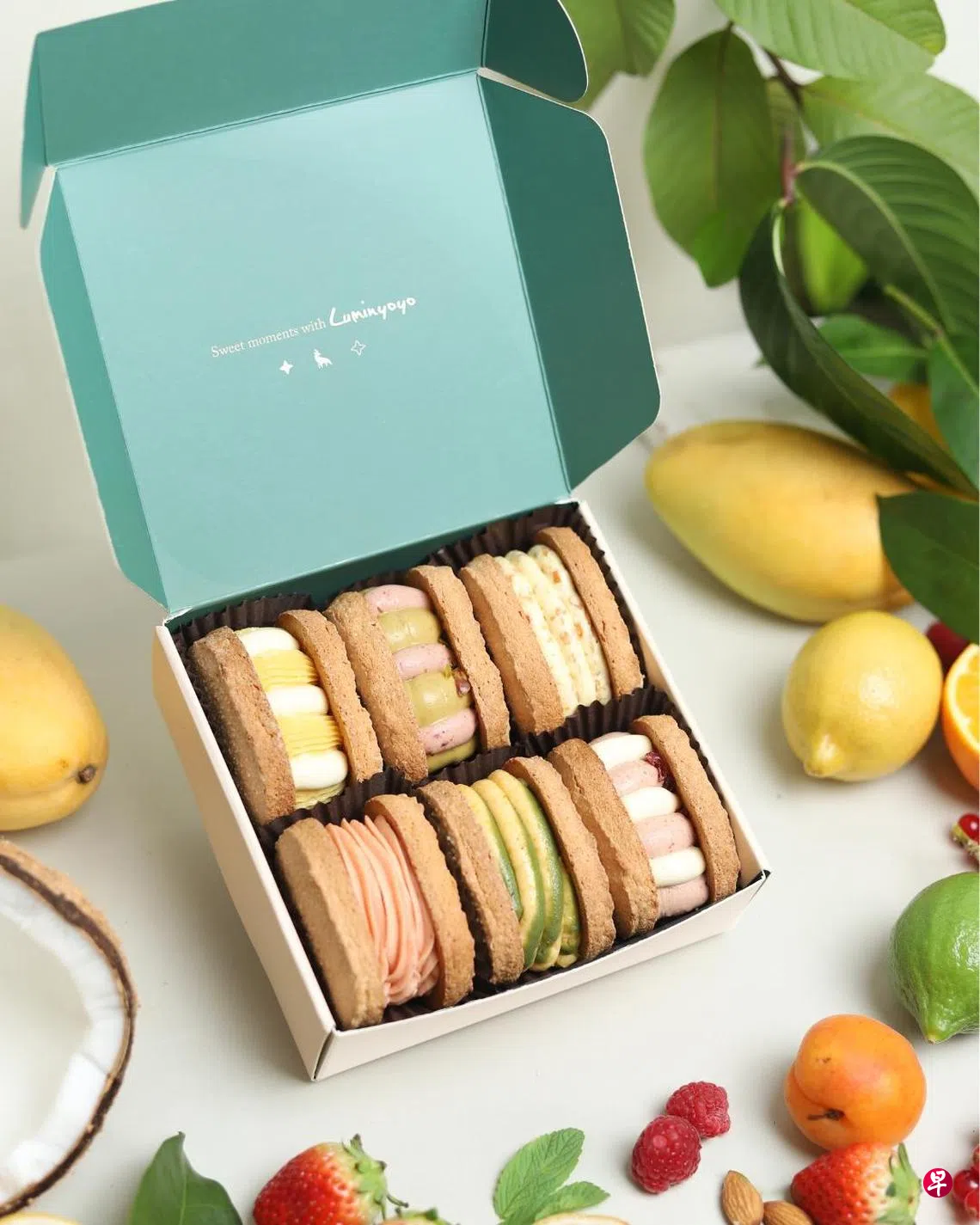 Luminyoyo的达克瓦兹有六种口味:百香果、芒果和奶油芝士;覆盆子和开心果;椰子、燕麦和杏桃;草莓、覆盆子和红加仑;佛手柑、葡萄柚、橘子和抹茶;覆盆子、蔓越莓、草莓和奶油芝士,选自各地的优质食材制作。首推覆盆子和开心果口味,用意大利开心果泥、美国开心果、法国覆盆子果酱、新西兰草莓粉、巴布亚新几内亚香草莢,还有澳洲全脂牛奶制成,胜在甜度适中,开心果的醇香和莓子的酸甜相辅相成,吃起来较没负担。