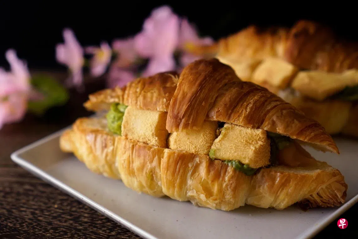 最特别的是樱花麻糬牛角面包。香酥的面包里,夹有软糯的麻糬和樱花豆泥,搭配抹茶鲜奶油和黄豆粉,呈现香甜带嚼劲的微妙口感。同样有麻糬内馅的艾草面包,将艾草磨成粉,然后融入面团里,让柔软Q弹的面包散发淡淡清香。内馅以麻糬搭配红豆泥,即经典的日式甜面包组合。