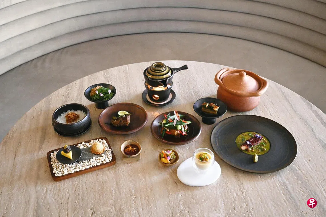 探店当天,品尝了五道式菜单。开胃菜epok epok是咖喱卜,是哈菲祖尔·哈希姆儿时爱吃的点心,不同于一般咖喱卜,内陷塞满蓝蟹肉与西班牙蟹肉,搭配辣椒螃蟹参峇酱。另一道称为”Ma Hor”的开胃菜其实是泰国菜,将蜜饯鸭肉、大虾、脆花生、香菜,以及泰国辣椒用大火煮至焦糖状,然后将焦糖糊混合物完全冷却,形成糊状物,将其捏成圆球状,放在鲜嫩多汁的黄梨上一口享用。