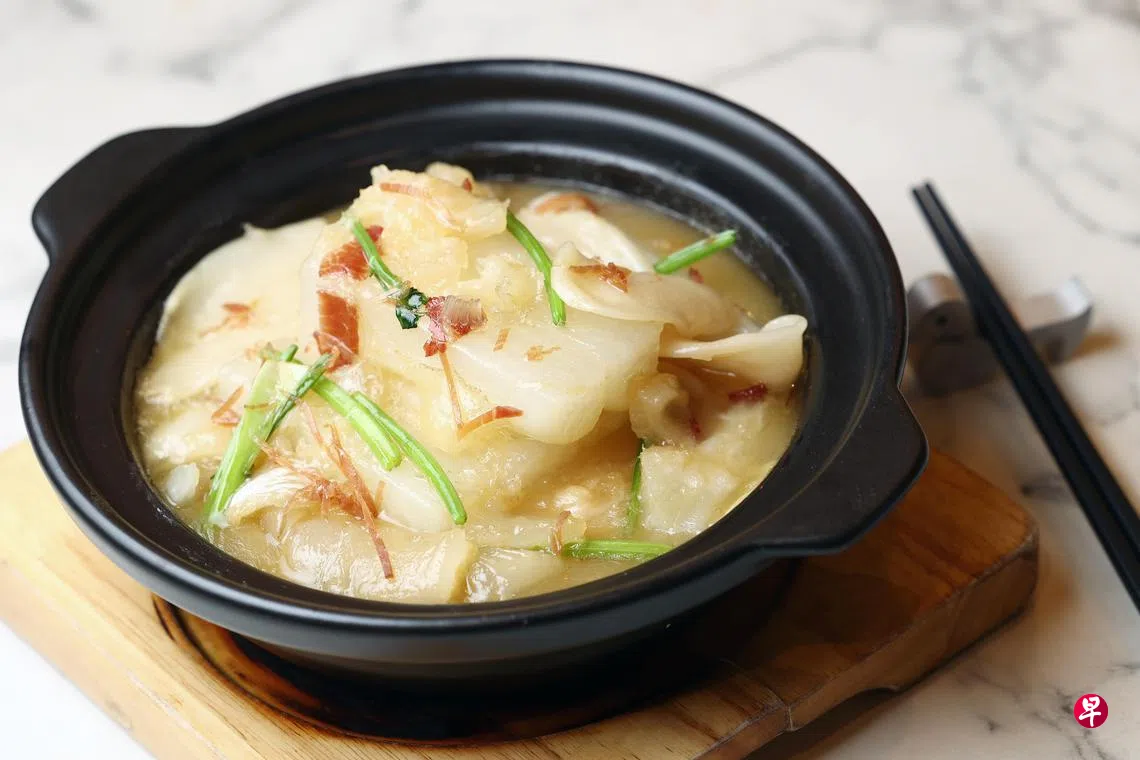 白萝卜价廉物美,搭配花胶一起烹煮,可提升菜肴档次。冯师傅说:“花胶本身味清淡,所以我加入金华火腿,增添咸味。若家里没有金华火腿,可以用帕尔玛火腿或咸猪肉来代替。”享用这道菜时,可尝到白萝卜的清甜,金华火腿的香,加入花胶焖煮汤汁会起胶质,适合配饭享用。