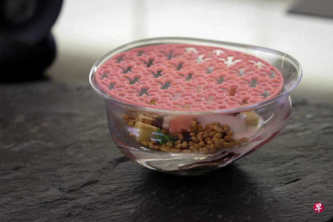 甜品以名为“Kinmokusei”最讨喜。名字取自金木犀桂花,以日本梨片,搭配桂花冻和白桃冰糕,酸中带甜的清新口感丰富多层,让味蕾为之一振。名为“京都”(Kyoto)的甜点,则选用京都茶道级单品抹茶做成慕斯,配上樱花冻,茶香中增添春天的气息。