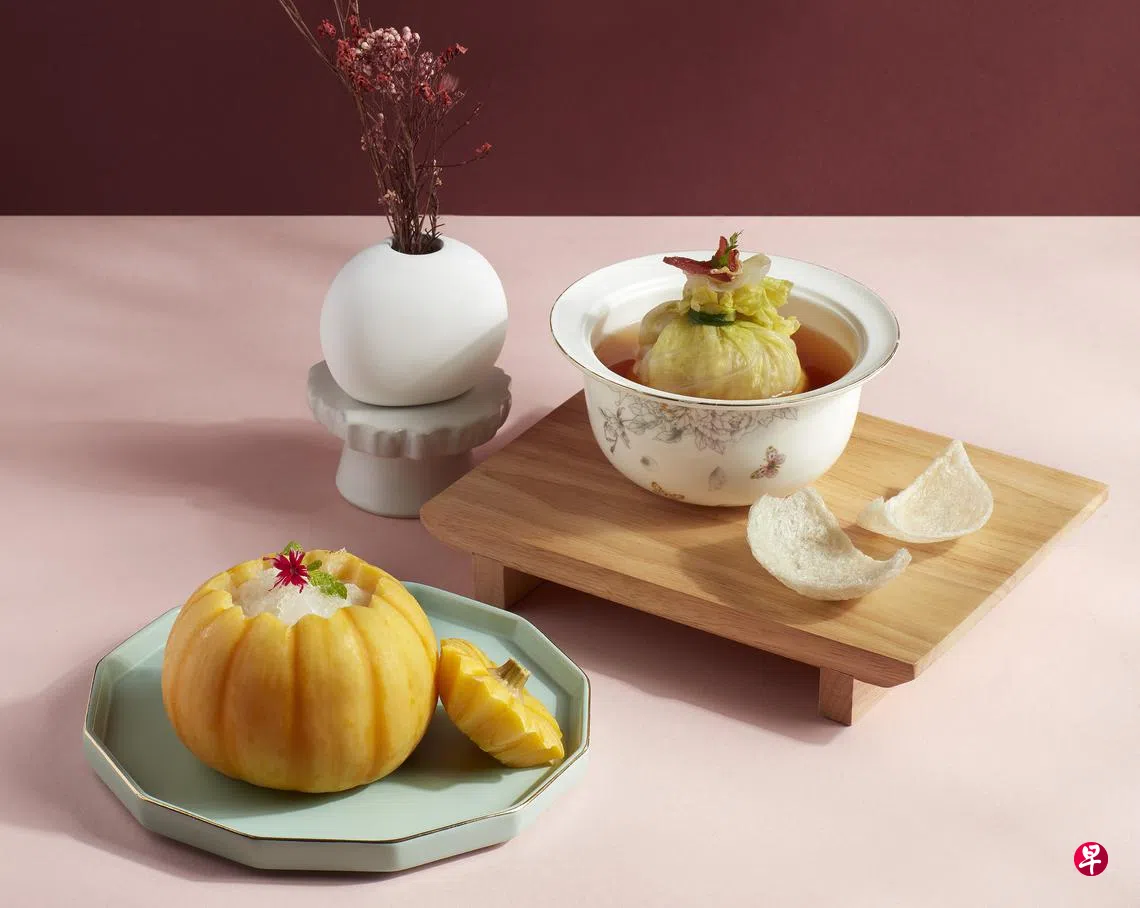 翡翠金阁则推出酥炸紫苏日本生蚝(六个$18)、二十年陈皮鹌鹑炖花胶汤(一人$48)、脆生晒虾干葱猪油渣捞日本鸡蛋面线($38)、金瓜椰汁福果炖官燕(一人$68)。