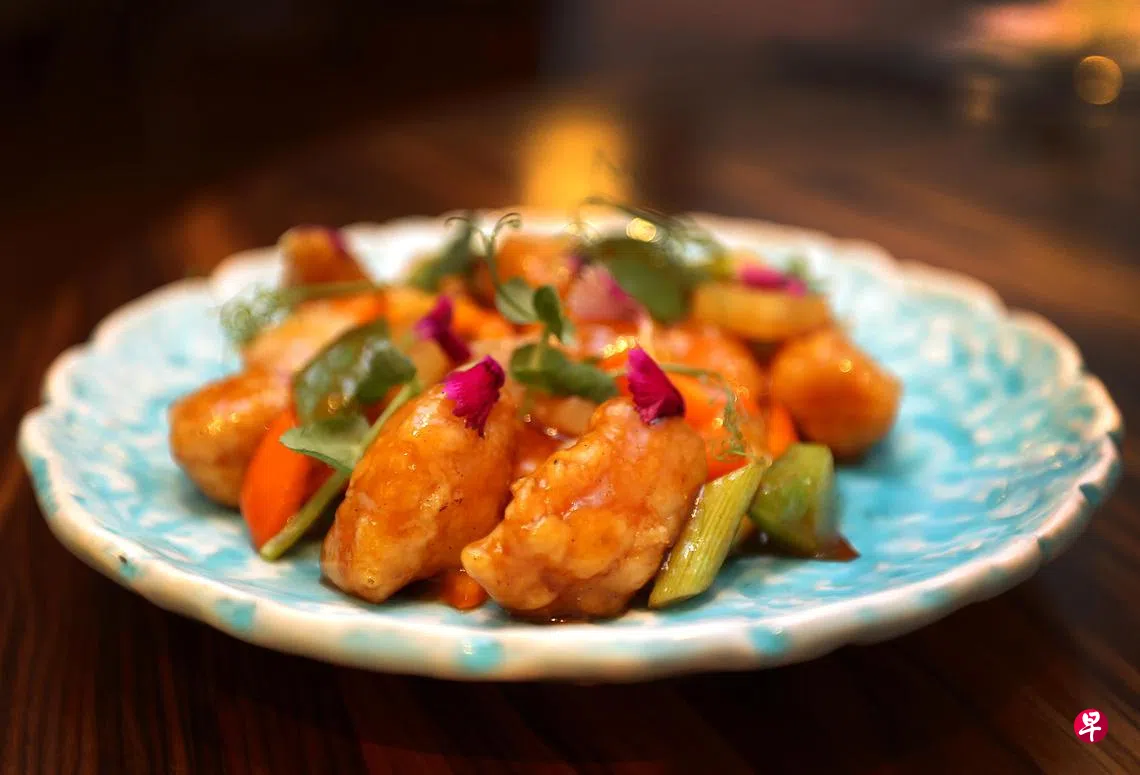 咕噜肉,酱汁是灵魂。张浪然师傅说:“我们在调配芡汁时添加了一些果醋,为菜品增添一抹果香味。总体而言,我们延续了传统的食材组合,只对酱汁做了些许调整,使得菜品更加美味。”他发现近来,咕噜肉的呈现方式多样化,包括冰镇、加入不同水果、调制香辣口味,以及采用健康食材如鸡胸肉制作的健康咕噜肉等。