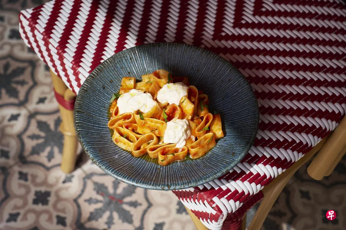 香辣茄酱意大利面是一道经典的意大利面食,该酱料有番茄的酸甜、红辣椒的香辣、大蒜的风味,通常用意大利通心面Rigatoni烹制,餐馆选择用青铜模具挤压的Calamarata意大利面,口感更丰富。