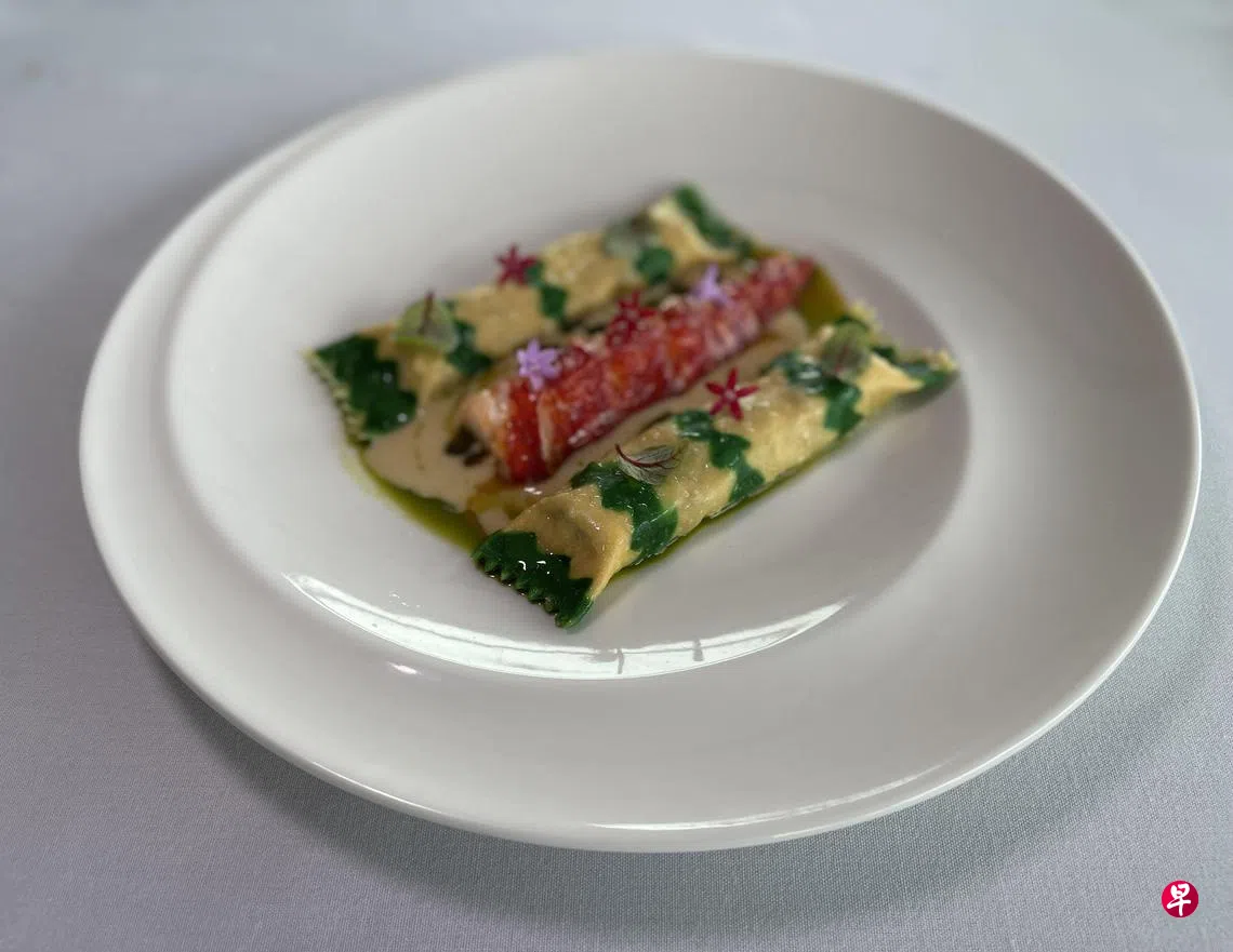 地中海料理讲究海鲜的运用,餐馆的法国蓝龙虾拌柚子法式白酱汁,搭配以菠菜和乳清芝士为内馅的意大利饺。厨师为了方便客人食用,特地将意大利饺做成跟龙虾一样的长条状。鲜嫩的龙虾肉保留原汁原味,意大利饺则带嚼劲,吃出两种不同口感。