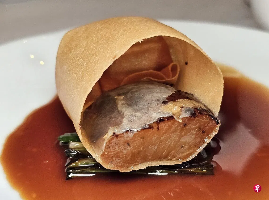 另一道是香港Wing餐馆主厨郑永麒(Vicky Cheng)上星期来新加坡献艺时的拿手菜葱烧婆参春卷。5月17日至19日,他与新加坡嘉佩乐酒店(Capella Singapore)中餐馆凯嘉(Cassia)主厨陈伟伦合作限时美味活动。