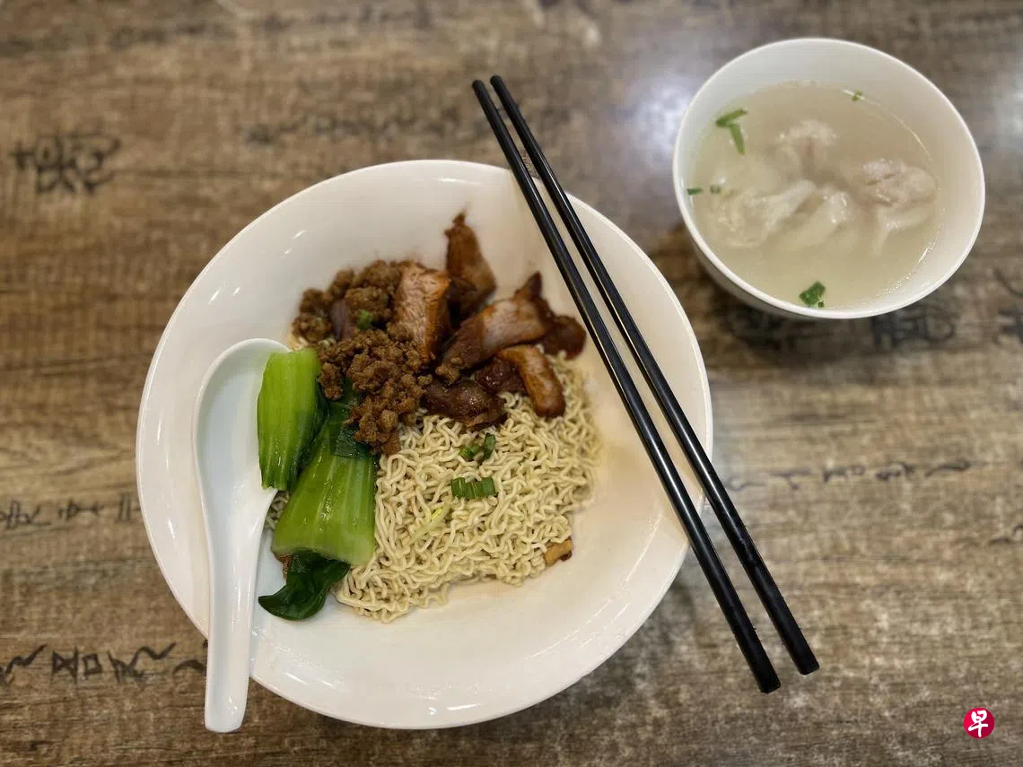 猪油渣可说是哥罗面的“灵魂”,弯弯曲曲的面条沾着猪油,同时卷起炸得金黄的猪油渣,独特的油香扑鼻而来,面条的独特风味更上一层。哥罗面配料与叉烧云吞面大同小异,只是多了炒香的猪肉碎与葱油。猪肉碎的香气,有点像介于肉脞面和云吞面之间,吃一口咸香的猪肉碎,配一口香甜的叉烧,微妙地中和了咸与甜,口感十分和谐,味道香浓不腻。